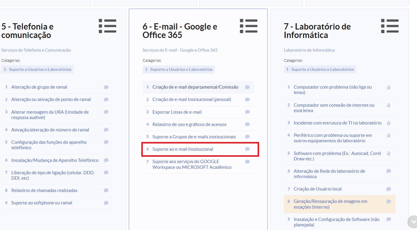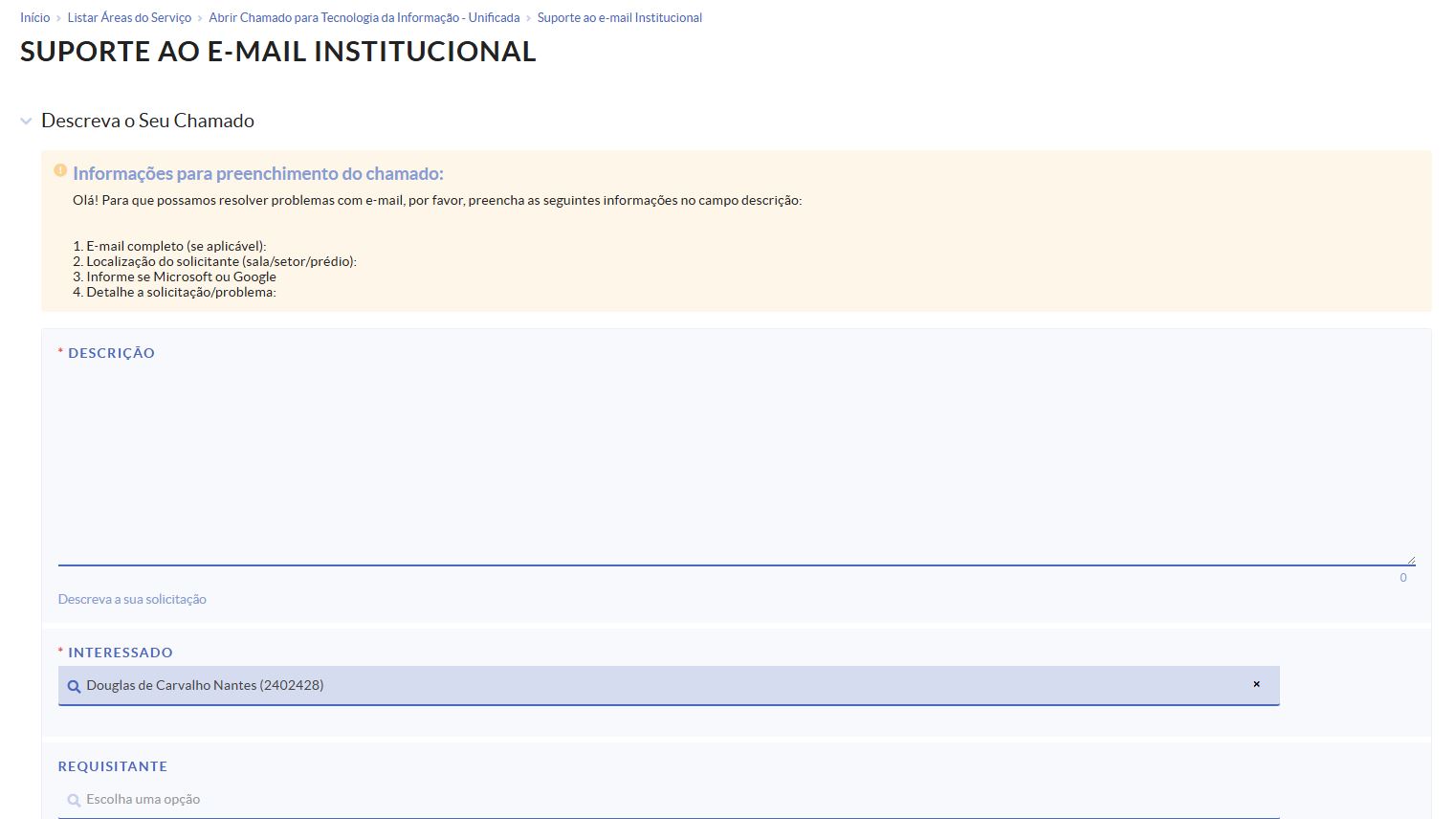 Obs.: Na descrição do chamado poderá informar que a senha expirou, esqueceu a senha ou que precisa mudar a senha do e-mail institucional, ou problemas com a autenticação duplo fator 2FA.
