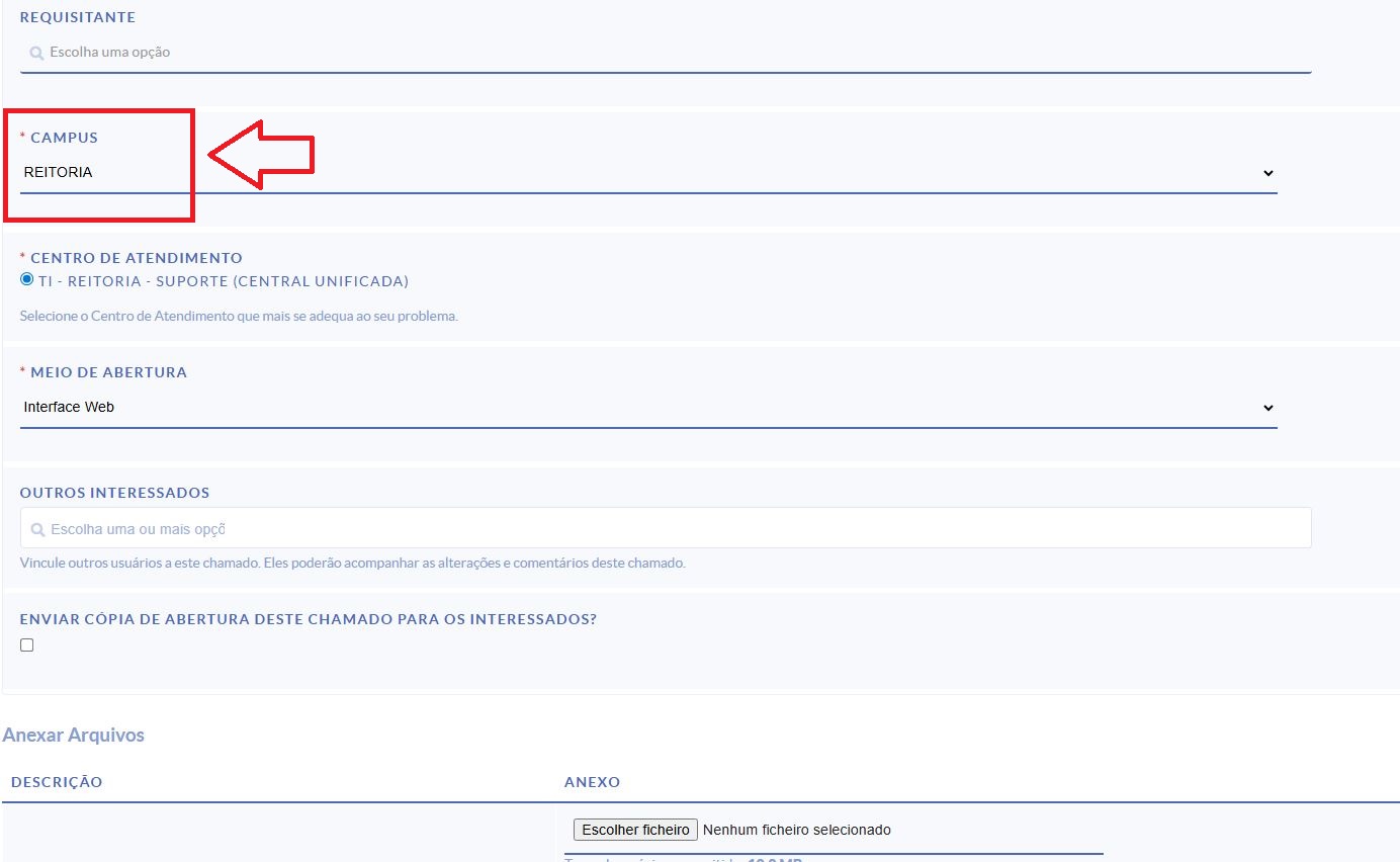 8º Preencher o chamado com a descrição, e interessado caso tenha outros interessados , colocar como campus a Reitoria