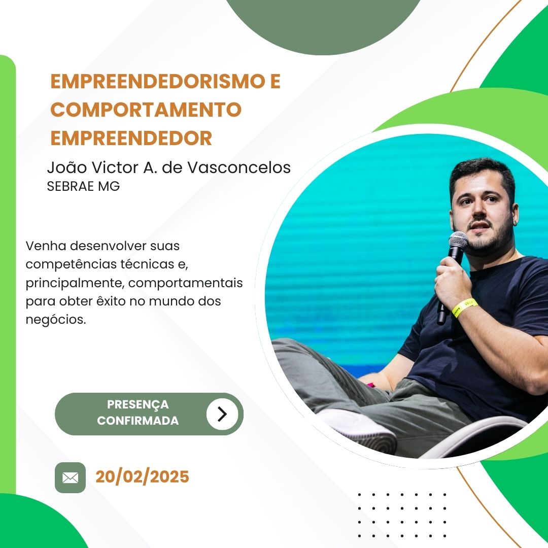 👨🏫 Palestrante : João Victor A. de Vasconcelos Graduado em Administração, com MBA em Gestão e Finanças pela Fundação Getúlio Vargas. Especialista em empreendedorismo e gestão financeira, atua como consultor e palestrante no Sebrae-MG, com experiência em modelagem de negócios, planejamento financeiro e gestão de indicadores, sempre focado em estratégias para otimização de resultados e sustentabilidade de micro e pequenas empresas.